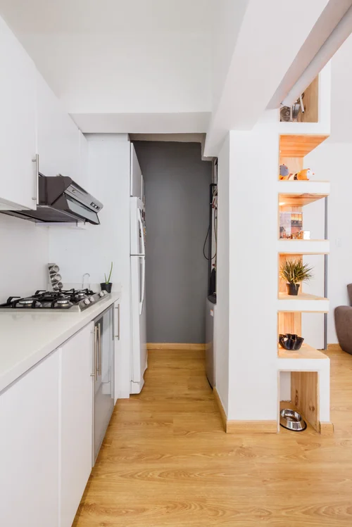 The best solution we found was to move the entry door a few inches towards the living room allowing us to convert the wall that divided the kitchen into a module capable of storing and organizing all the appliances it created laundry area while providing privacy into the living area.